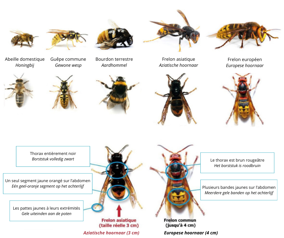 - Europese hoornaar: groter, roodbruin, met een grotendeels gele achterlijf.