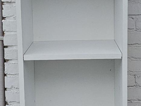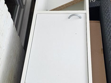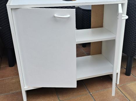 Un meuble sous-lavabo H60xL65xP30 et une colonne de rangement de H182xL35xP30. En blanc. Avec les planches d'étagères. Etat usé mais encore correct.